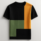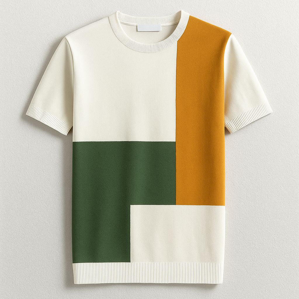 - Geometric color-block design