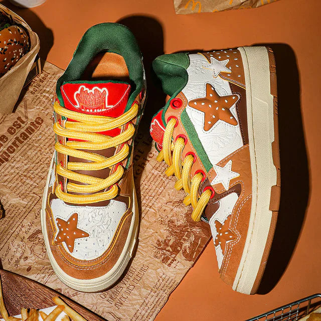 Step out in style with our Miss Mickie Leather Sneakers, where burger-themed fun meets supreme comfort. These bold, eye-catching shoes are perfect for those who love to stand out and express their quirky individuality with every step.