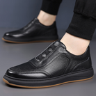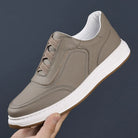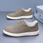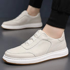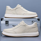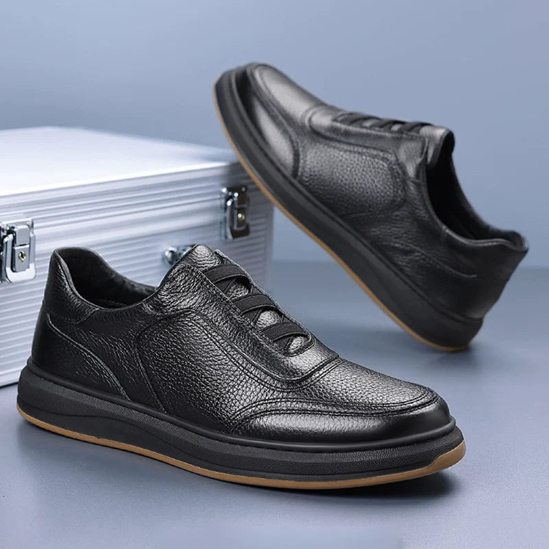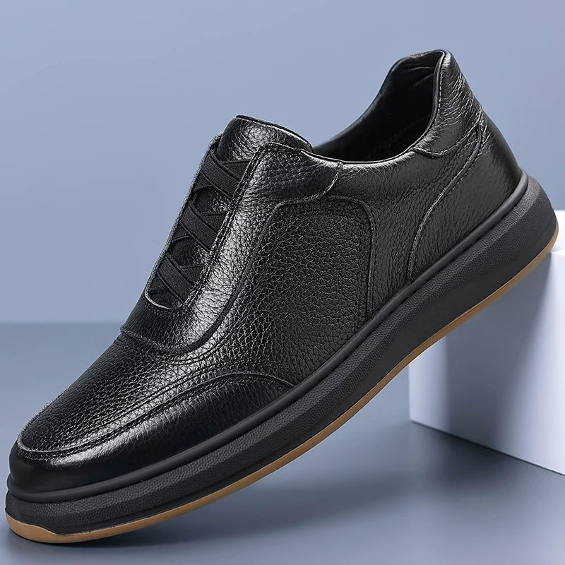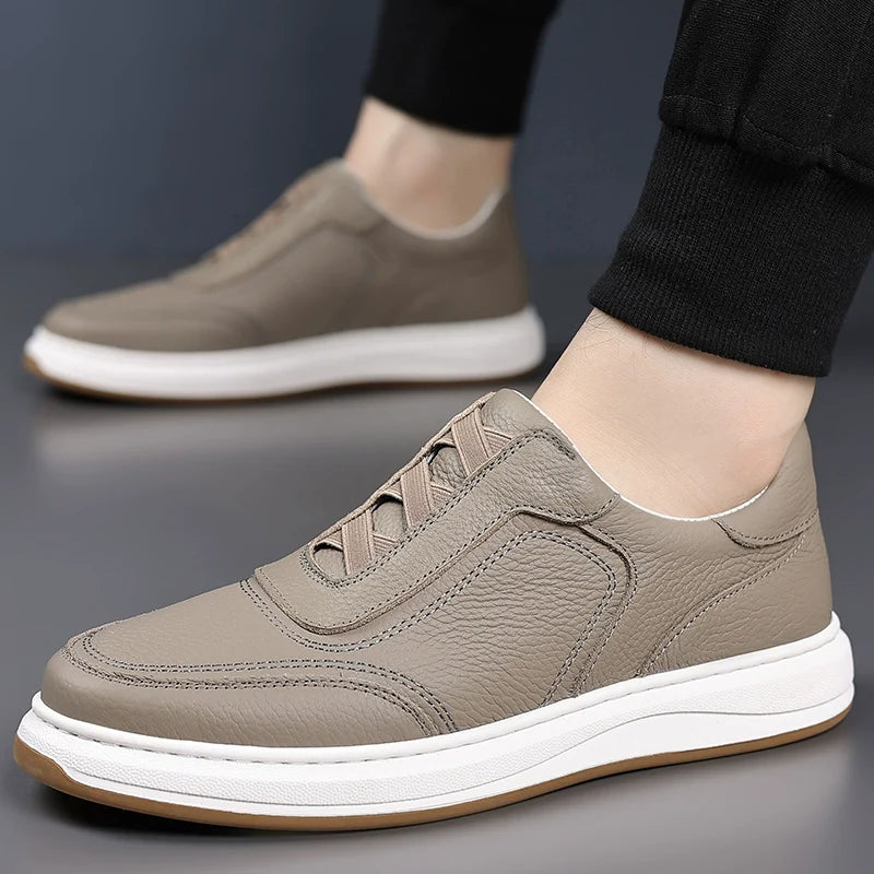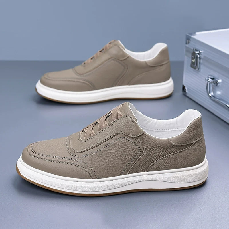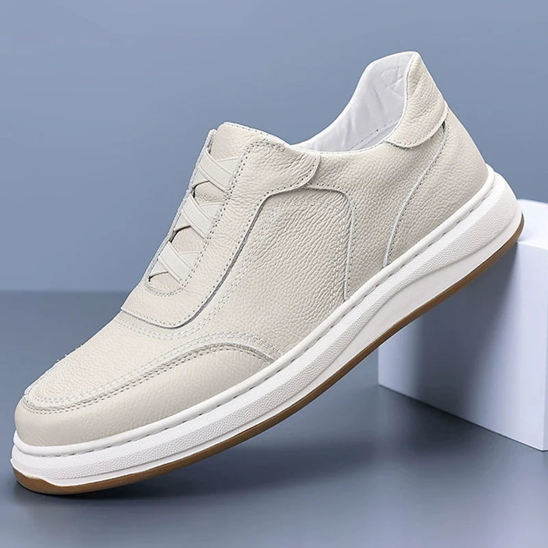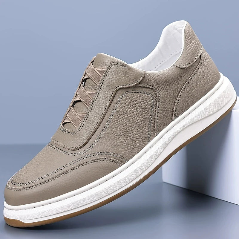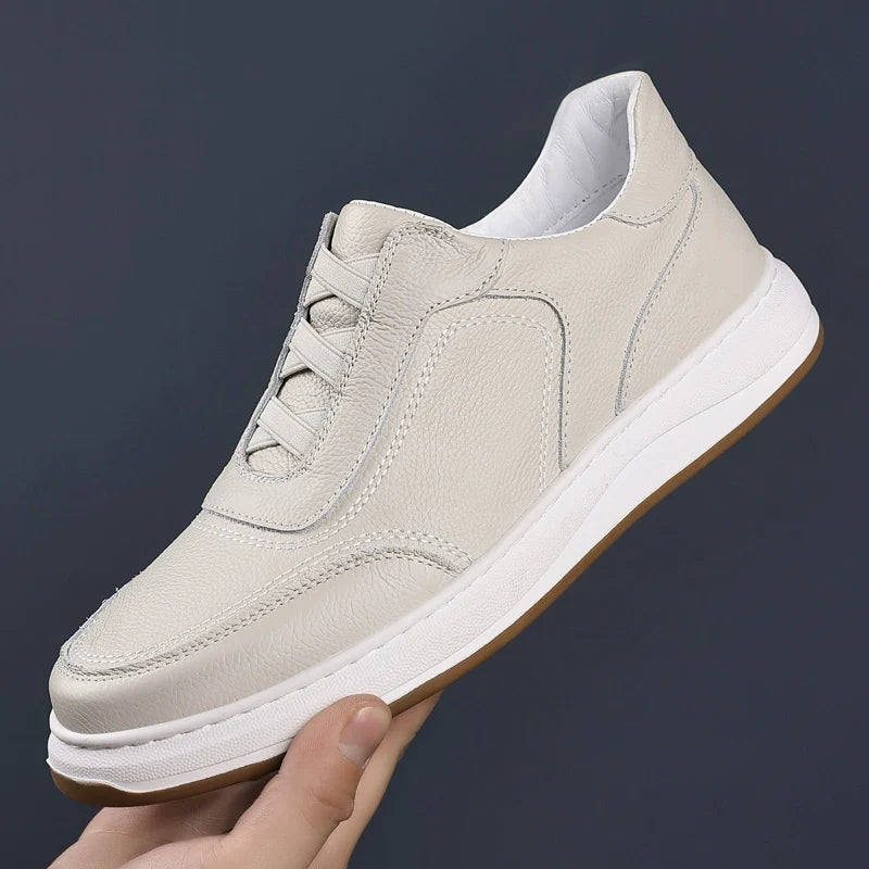 A modern take on a classic sneaker features a smooth, genuine Italian leather upper with subtle stitching details and signature loop lacing for a refined look.